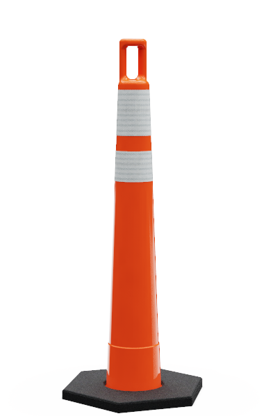 42″ orange C42 channelizer with Diamond Grade reflective striping featuring FOUR 4″ Bands of DG Sheeting